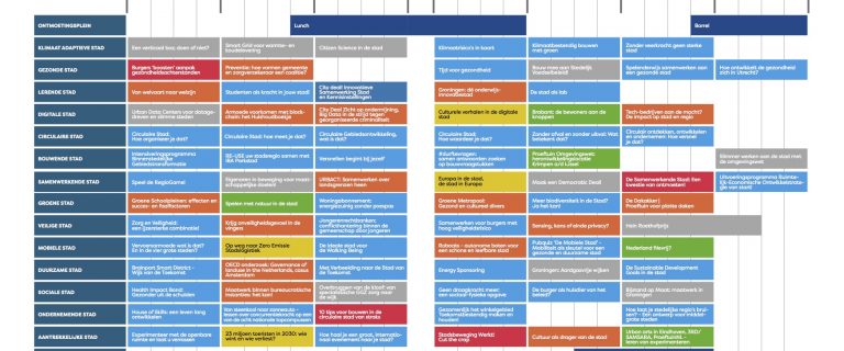 Dit blokkenschema is in bewerking. Waar nu nog witte vakken zijn, publiceren we binnenkort meer sessies. Aanvullende sessies voegen wij dagelijks toe. Het is mogelijk dat sessies in dit schema tot kort voor de Dag van de Stad nog van inhoud of tijdstip veranderen.
