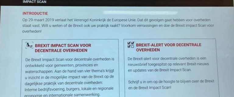 De Brexit Impact Scan is te vinden op de website van Europa Decentraal. Daar kunnen bezoekers zich tevens aanmelden voor een Brexit-alert; dan ontvangen ze wekelijks updates over Brexit-ontwikkelingen die voor hun organisatie relevant zijn.