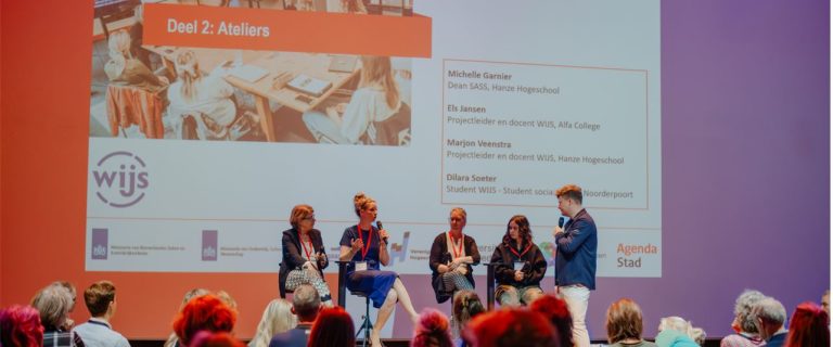 Tijdens het eerste panelgesprek maken we kennis met de studentenateliers in de stad Groningen. Hier werken studenten onder begeleiding van studentcoaches aan diverse (collectieve) vraagstukken die in wijken spelen. “Worden vraagstukken dan meteen opgelost?” vraagt Gijs aan het panel. Ieder half jaar werkt een groep studenten aan diverse problemen en uitdagingen, waarna de volgende groep studenten voortbouwt op de resultaten van de vorige groep. De opgaven zijn van dien aard dat ze niet binnen een semester opgelost kunnen worden, maar dankzij het estafetteleren ontwikkelt de wijk zich verder en werken studenten doorlopend in een uitdagende leeromgeving aan echte opgaven. Zo leren zij samen te werken met bewoners, met studenten van andere opleidingen en onderwijsinstellingen en met maatschappelijke organisaties, gemeenten en het bedrijfsleven. Kortom, een win-win situatie waarbij verbinding het sleutelwoord is.